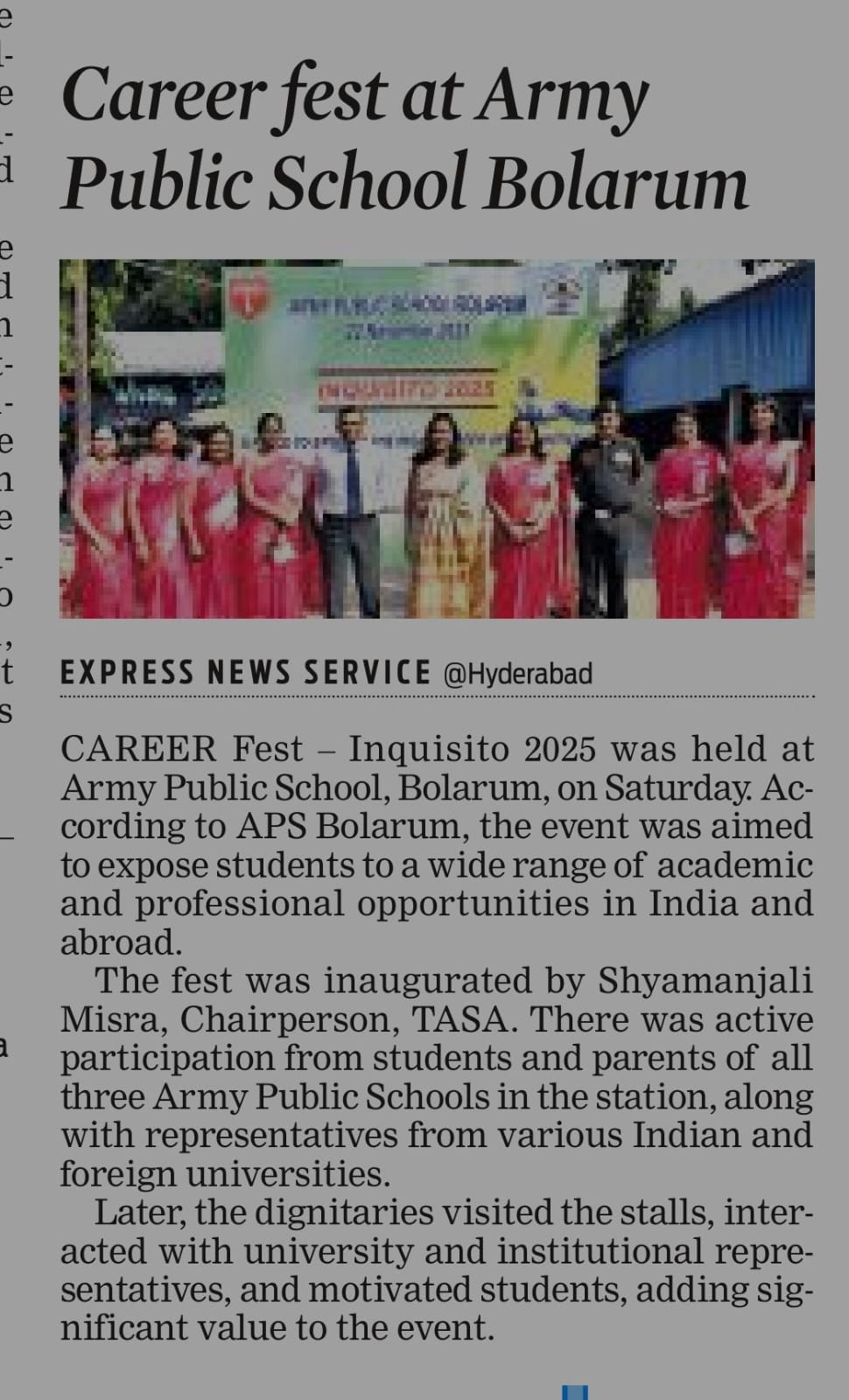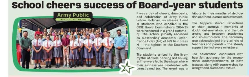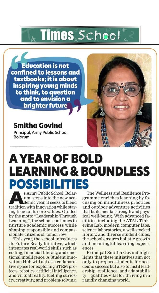 APS Bolarum is much more than a cluster of buildings of brick and mortar. It is a creative, innovative and dynamic place of learning where characters are built by touching hearts, enriching minds and nurturing talents. It is our constant endeavor to make education a purposeful, enriching and enjoyable experience for our students.
